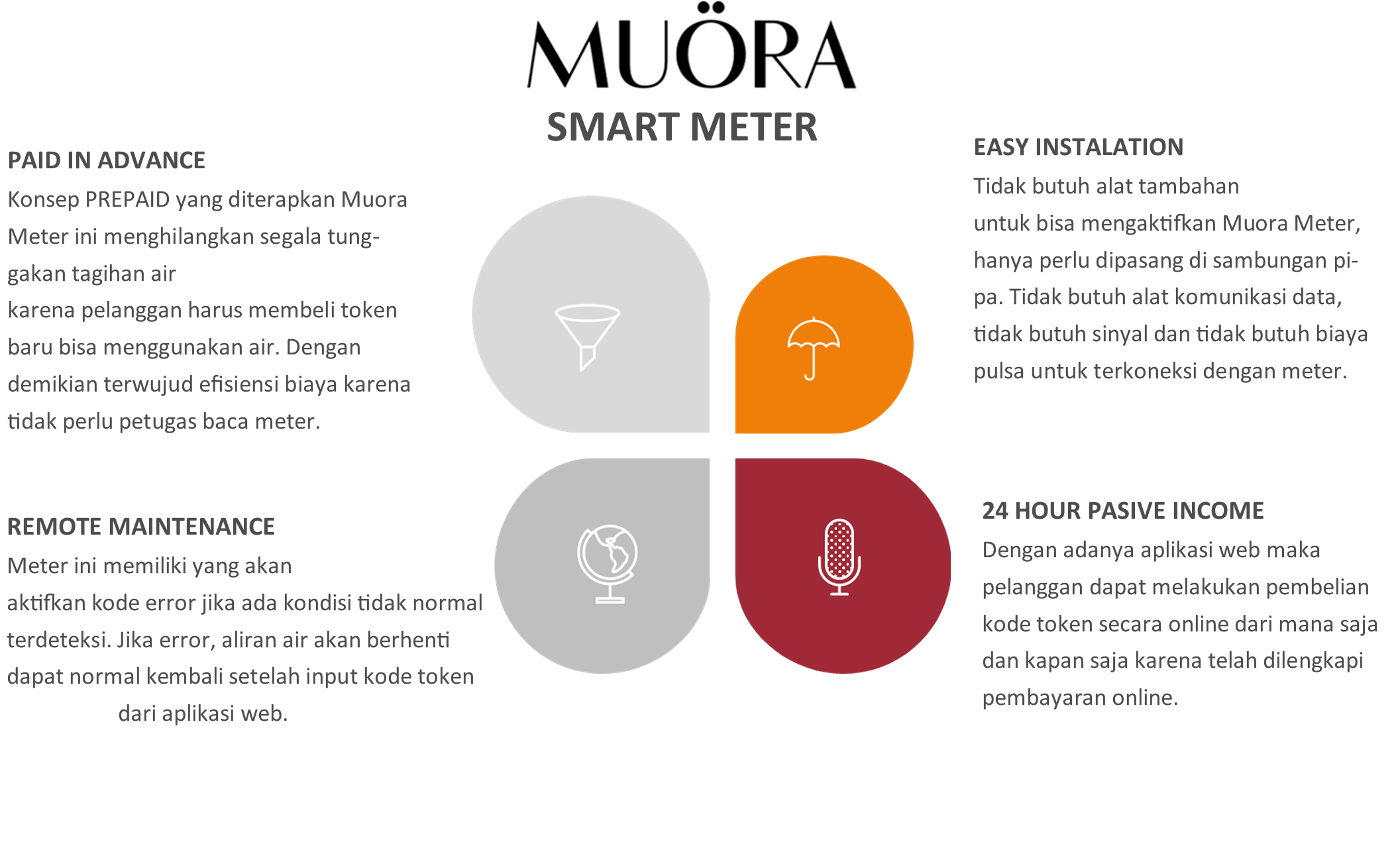 MUORA STS Smart Water Meter adalah Meter Air yang bekerja berdasarkan batas nilai m3 kredit air yang dapat dipakai oleh pengguna meter. Kredit air ini didapat dari serangkaian kode angka (20-digit) yang ditekan pada keypad meteran air.